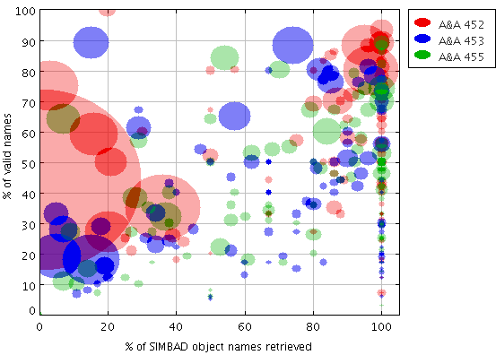 This plot uses the area of "error ellipses" to represent the significance of points — here each point represents a paper published in Astronomy & Astrophysics and the size of the point represents the number of astronomical objects referenced in that paper. This use of "error bars" for purposes other than representing errors is a good way to display higher-dimensional aspects of the data. The graphic here is the result of exporting from plot window to an image rather than a screenshot of TOPCAT at work, so the figure is presented on its own without the surrounding window.