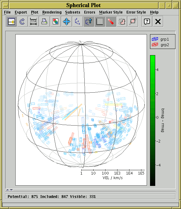 Points with a sky position and a radial coordinate (this may represent either spatial position from the centre or some notional non-spatial coordinate) are plotted within a spherical grid. Each point has additionally a tangential error (size or error on the plane of the sky) and a radial error. In this case the region corresponding to each point is marked out by a wire-frame cuboid, though a wide range of other representations is possible. Two different datasets are represented, in colours which are basically red or blue. However, and additional parameter (R-B colour) scales the green component of each point, so that objects whose detected colour are blue are more green in the plot (so bluer grp1 objects look more cyan and bluer grp2 objects look more yellow).