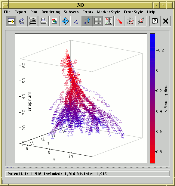 The following figure is similar, but in this case the spatially displayed dimensions are X, Y and timestep, and the galaxy colour is displayed on an auxiliary axis (redder points are redder galaxies). The data was obtained using the following query on the GAVO Millennium database: