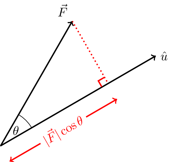 More generally \[ \vec{F} \cdot \hat{u} = \frac{\vec{F} \cdot \vec{u}}{|\vec{u}|} \] from which we get \[ \vec{F} \cdot \vec{u} = |\vec{F}||\vec{u}|\cos\theta \]