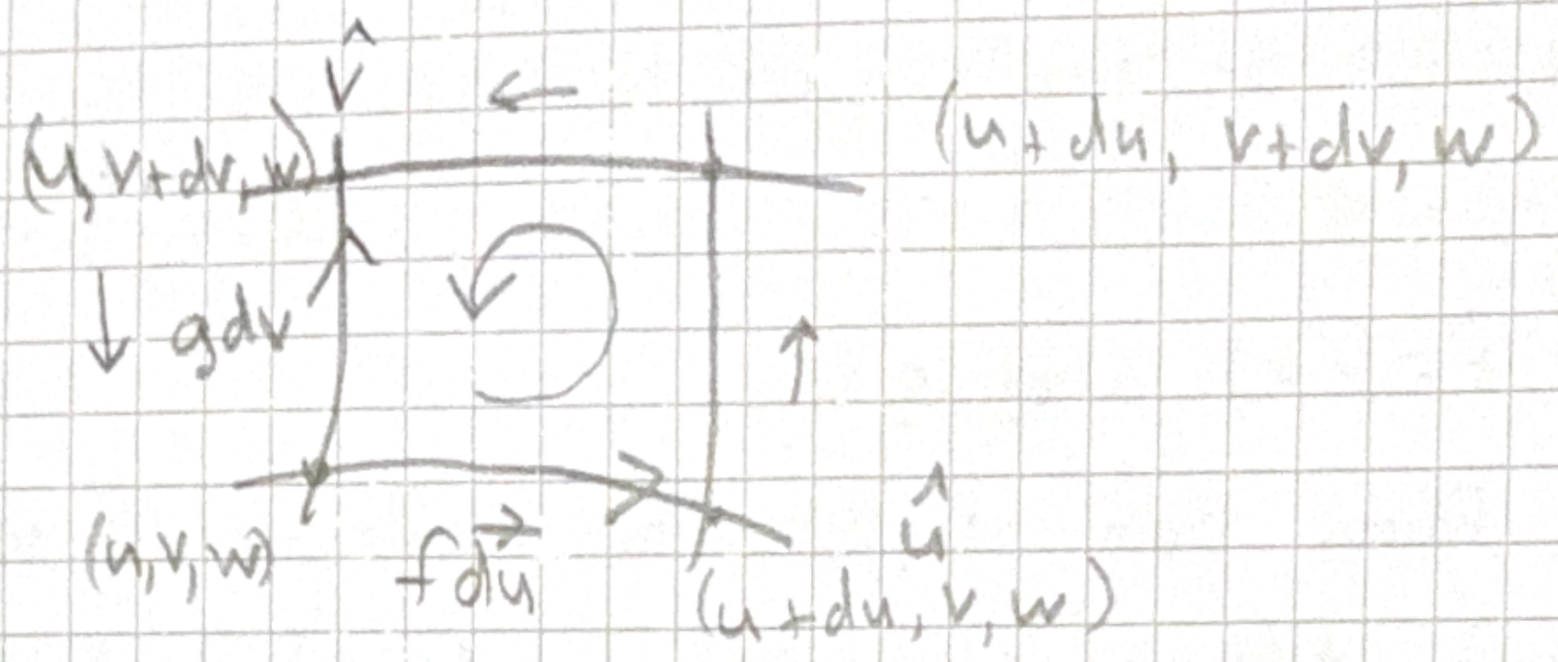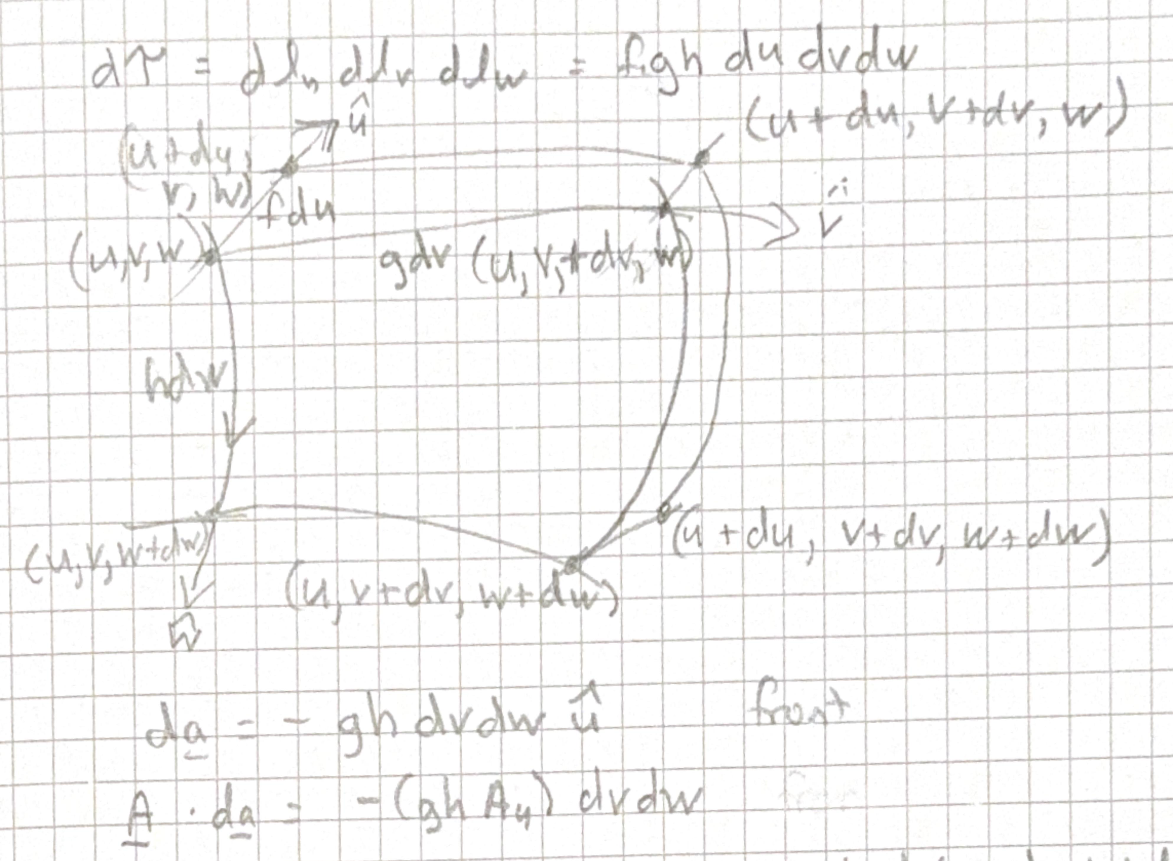 \[ \begin{aligned} F(u+d u)-F(u)&=\frac{d F}{d u} d u\\ \frac{\partial}{\partial u}\left(g h A_{u}\right) d u d v d w&=\frac{1}{f g h} \frac{\partial}{\partial u}\left(g h A_{u}\right) d \tau \end{aligned} \] left and right hand sides yield \[ \frac{\partial}{\partial v}\left(f h A_{v}\right) d u d v d w=\frac{1}{f g h} \frac{\partial}{\partial v}\left(f h A_{v}\right) d \tau \] and top and bottom \[ \frac{\partial}{\partial w}\left(f_{g} A_{w}\right) d u d v d w=\frac{1}{f_{g h}} \frac{\partial}{\partial w}\left(f_{g} A_{w}\right) d T \]